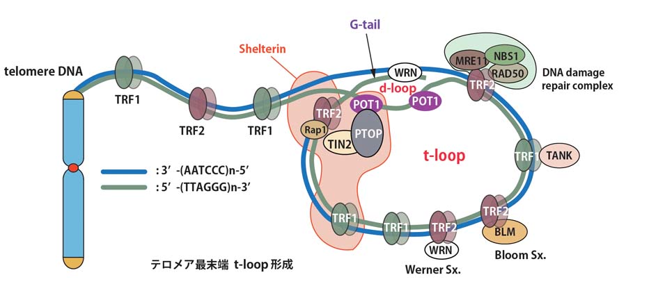 テロメア最末端はDNA損傷として認識されないよう, そのテロメア一本鎖突出末端のG tailが二本鎖テロメアDNAが開裂した部分に入り込みd-loopを形成している.