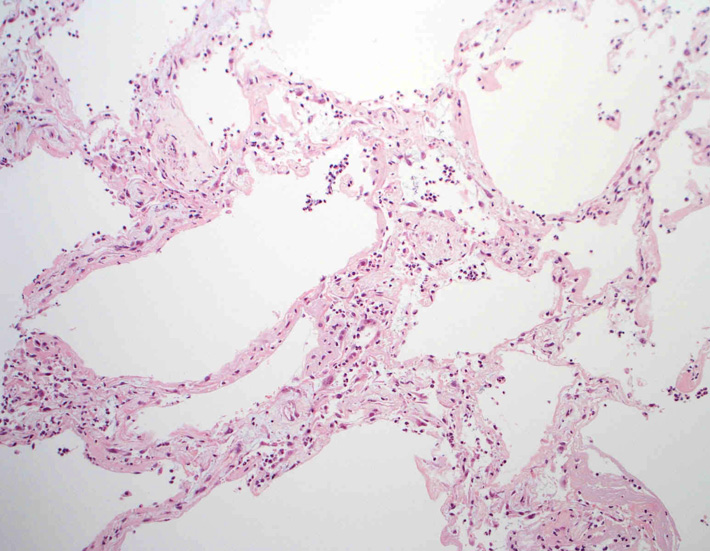 肺胞壁に多数の好中球浸潤。肺胞腔内に出血。 capillaritisが起こるWegener' granulomatosis劇症型には, なかなか肉芽腫性病変を見つけることは難しい