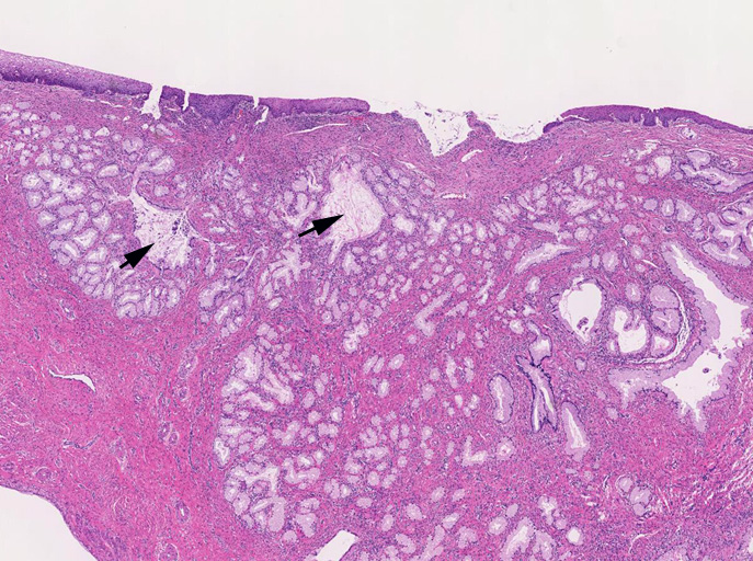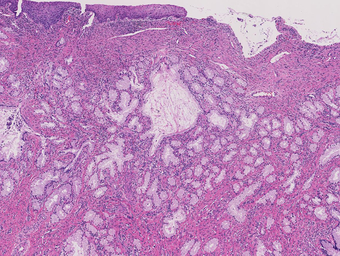 ■ 子宮頚管腺に類似した高円柱上皮よりなる腺管の著明な増生を認める。これらは大型で拡張した導管様腺管と,それを囲繞するように配列する分葉状構造をしめす小型腺管からなり, 嚢胞状に拡張した腺管も随所に認められる。最深部にみられる腺上皮は, 嚢胞状に拡張した腺管の一部と考えられる。