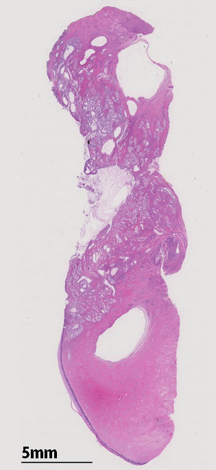 loupe像では, 拡張した導管を中心に高円柱上皮からなる腺管が分葉状に配置する所見が認められる。