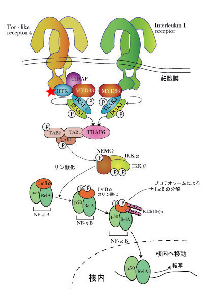 Burton's tyrosin kinaseを阻害するとMYD88を介するシグナルを阻害しNFkB活性化を押さえることができる。