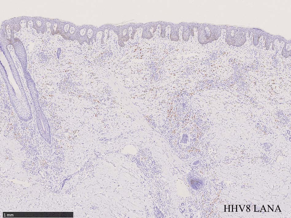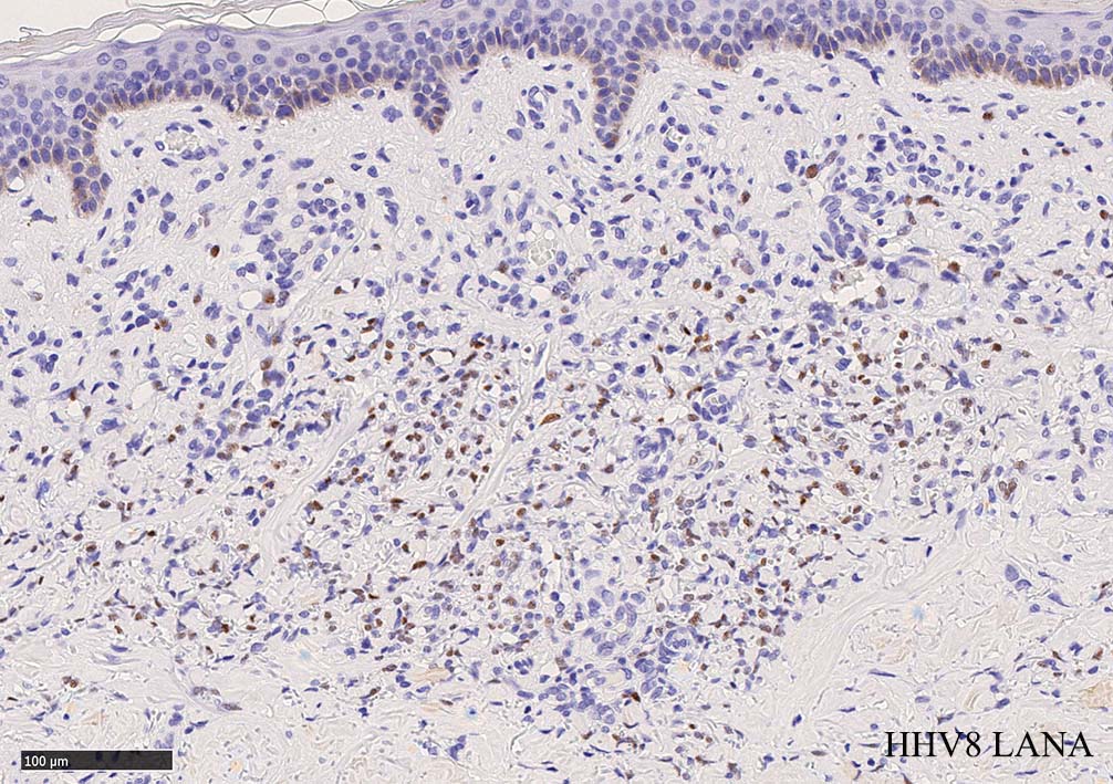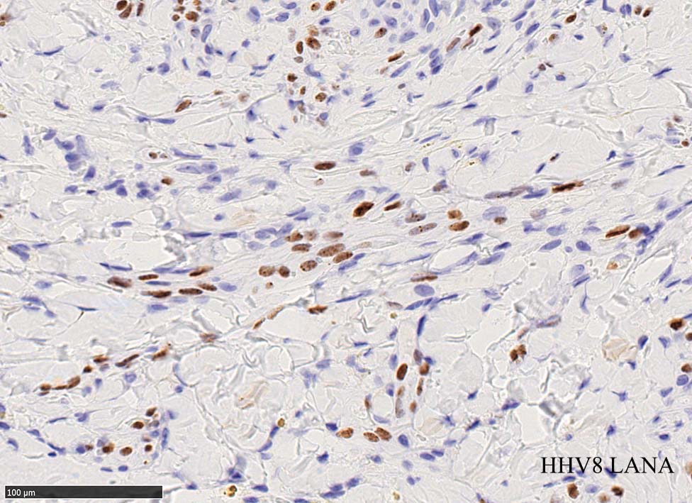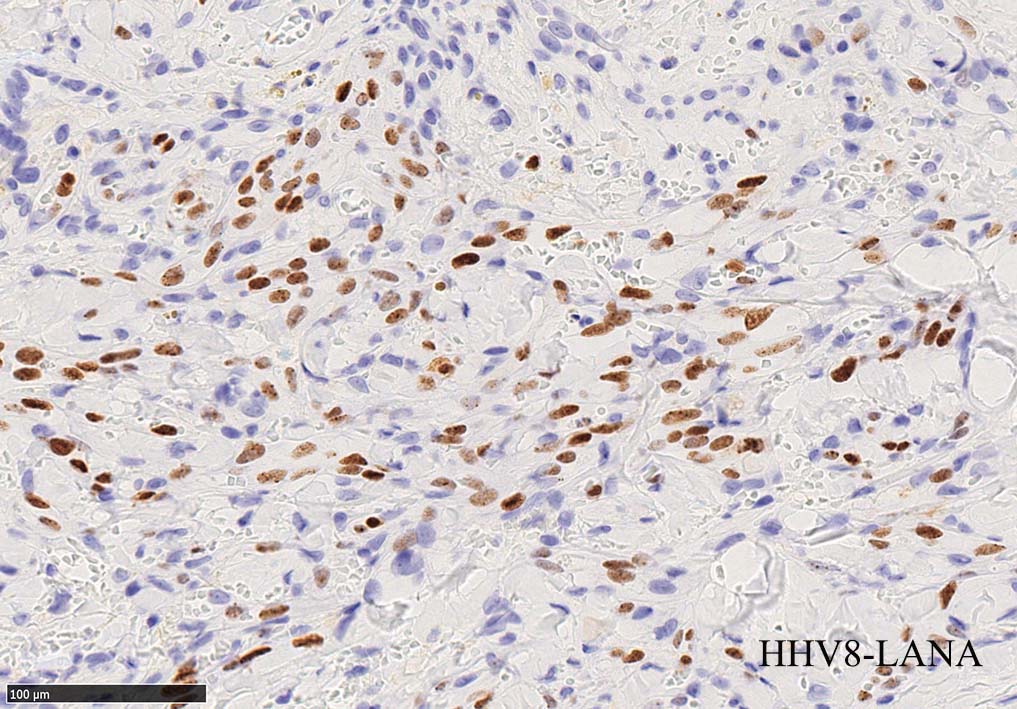 HHV-8の潜伏期関連抗原(HHV-8 Latency-associated nuclear antigen: HHV-8 LANA)が市販されており, 核が点状に染色される陽性所見がKaposi肉腫の確定診断に必須となっている.