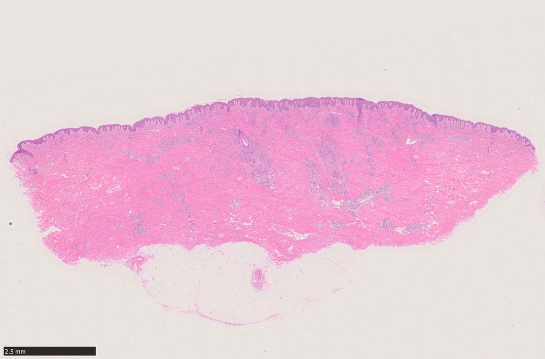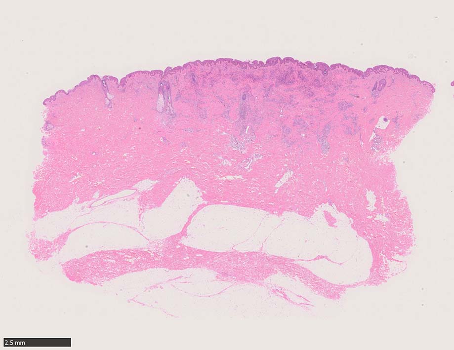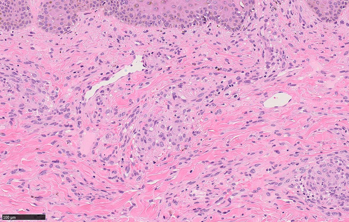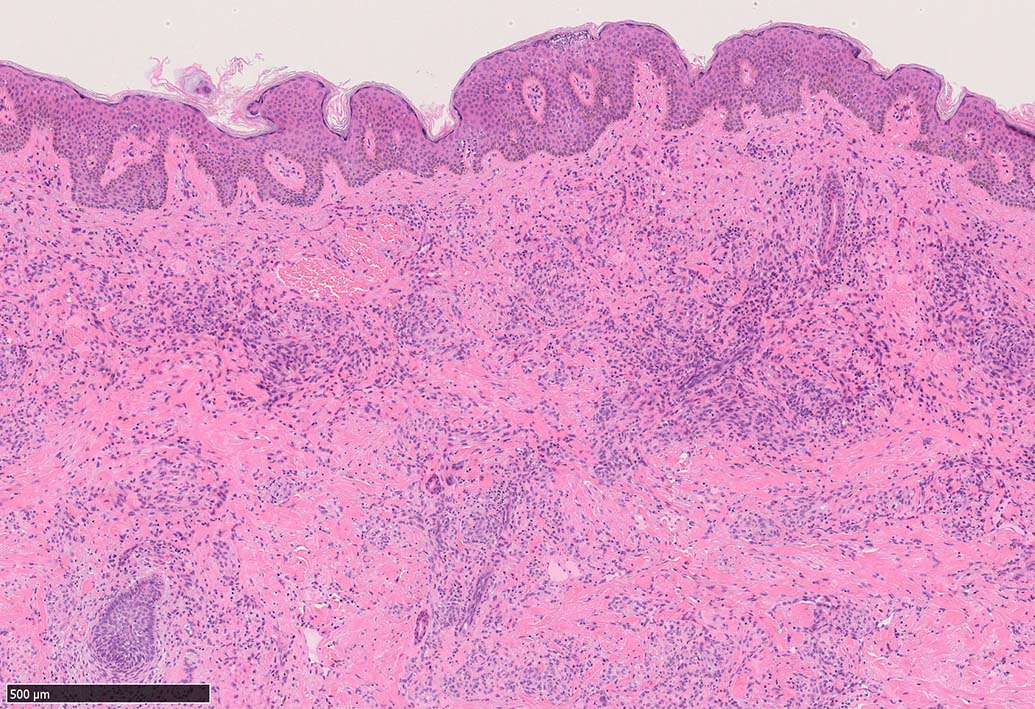 病変は真皮内に現局している. 初期斑状病変に相当すると考えられる. 本例では, 特徴とされる形質細胞浸潤増加はみられない.
