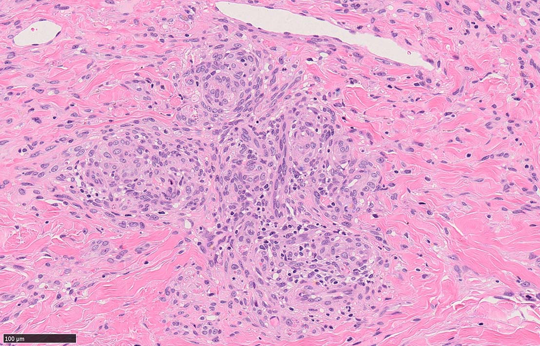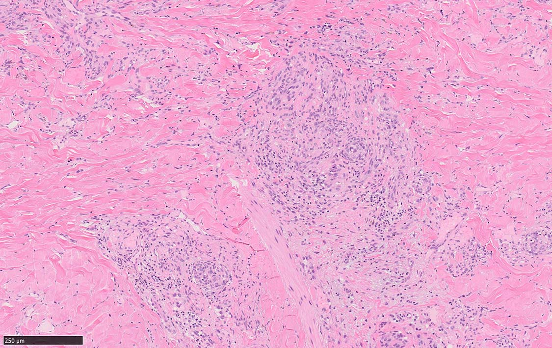 細血管周囲に血管内皮様の紡錘形細胞が増生, 一部に赤血球をいれた裂隙の形成がある. 細胞の異型はみられず, mitosisの増多もない. hemosiderin-laden macrophageが散在する.