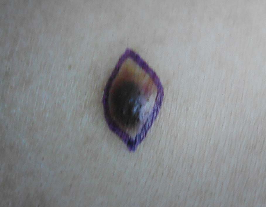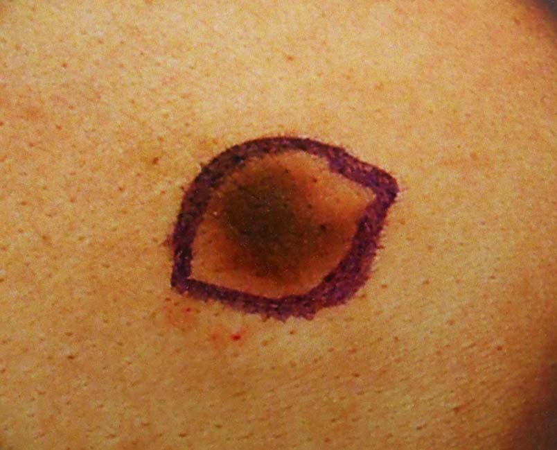 発疹/個疹は爪甲大の紫紅色斑から徐々に増大し結節状となる. 時間がたつにつれ濃い色調になり, 暗紅色から黒褐色になる.