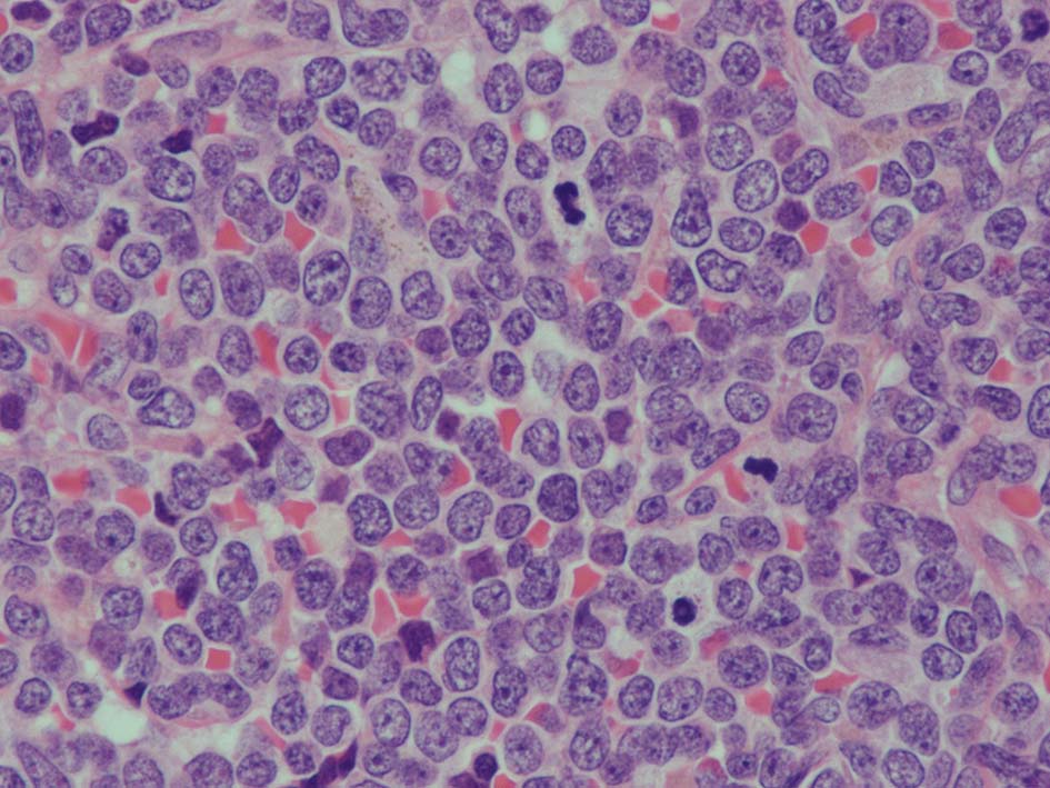 loupe像Aの領域: 精細管をスペアするように, 小型リンパ球優位, 一部中型のlymphoid cellsがシート状密に浸潤増殖する. tubulesのほとんどにはlymphoid cellsが浸潤していないが, LELに似たようなlympho-tubular lesionが少数認められた. x400高倍率では, 増殖細胞は, 粗く, 凝集したクロマチンをもつ類円形, non-cleavedな核をもつ細胞質の乏しいlymphoid cellsである. 核小体か凝集したクロマチンかわかりにくい.