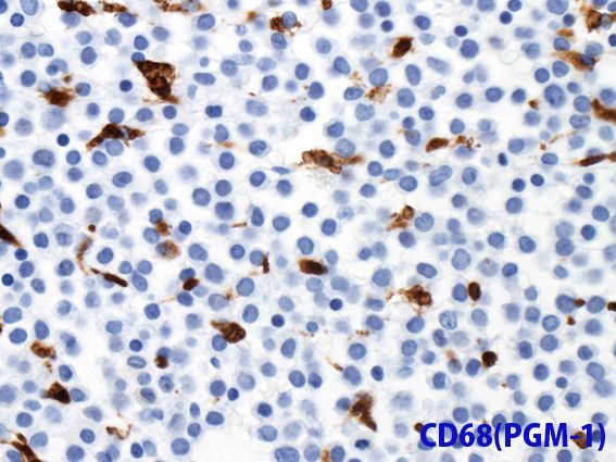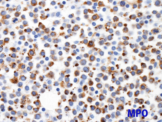 MPOは幼若芽球様細胞にびまん性に陽性。dot-likeな染色がめだつ。monocyte系の細胞をCD68(PG-M1)とCD163(10D6)で染色してみる。PG-M1は成熟した組織球単球に陽性となるため, 幼若な細胞は染まっていない。CD163は少数の幼若細胞に陽性となっており, わずかであるが単芽球が存在すると考えられる。MPOの結果とあわせてM4やM5とは違う染色結果です。単球系のAMLを染色する感度と特異性に満足の行く良い抗体は現在のところ見あたらない。CD68ではKP-1がPG-M1より幼若細胞に陽性となる。PG-M1は, より成熟した単球系細胞に陽性となるようです。しかしCD68は単球/マクロファージだけではなく上皮細胞やfibroblastにも反応して染まることが言われている。一方CD163はtissue microarayを使った解析で単球/マクロファージに特異的なマーカであるといわれている(Nguyen et al, 2005)。AMLについて, CD163は幼若な単芽球も+となるが単球系AMLの全症例がうまく染まるとは限らない。M4,M5の約1/4に陽性となるという報告がある。他のtypeのAMLでは全症例陰性であったという(Davey, et al, 1998).NguyenらはAML-M5で2/6caseにCD163がびまん性陽性となり, 他のAMLでは16例いずれも陰性と報告している。感度が弱いが陽性なら単球系といえるようです。