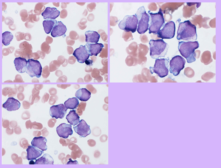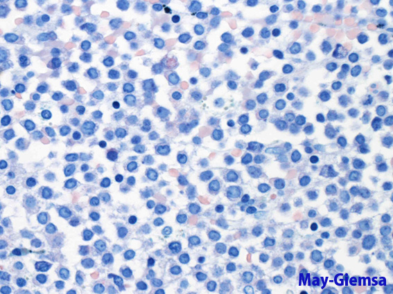 May-Giemsaでは幼若細胞の増殖があり正常造血は抑制されている。M1, M2にしては核の形が不揃いな印象がある。切れ込みのある核も見られる。