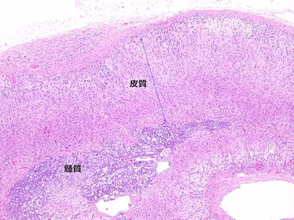 皮質には境界の不明瞭な3層構造が認められる. 被膜直下より, 球状層(Zona Glomerulosa), 束状層(Zona Fasciculata), 網状層(Zona Reticularis)と呼ばれ各々性状, 形態の異なる細胞より構成されている.