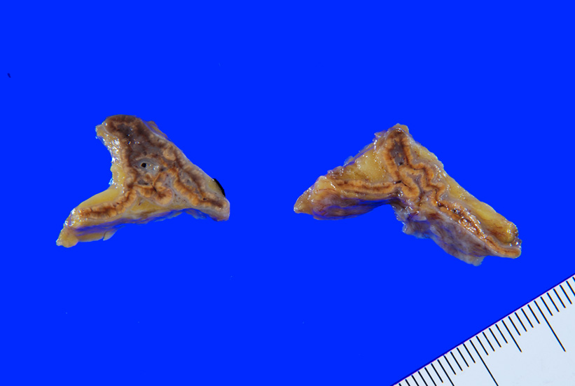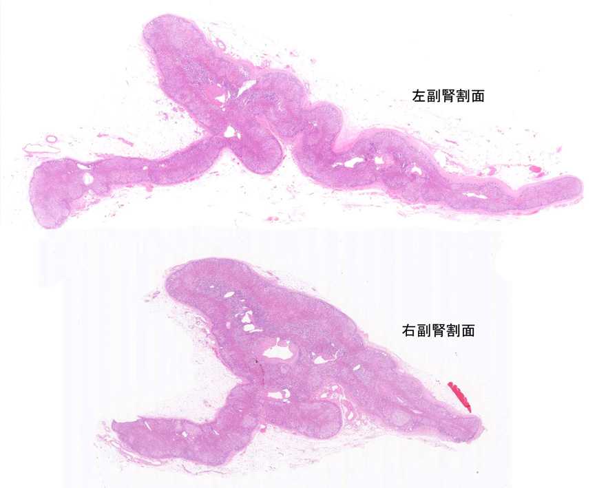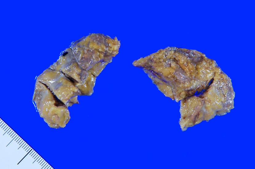 副腎肉眼像 (ホルマリン固定後, 検索のため, いくつか割が入っています。右の画像は割面です。)