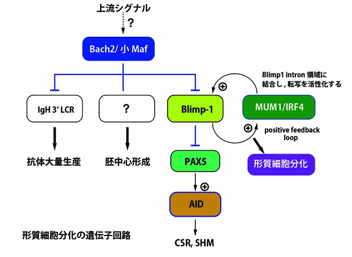 - AID発現を活性化するPax5遺伝子をBlimp-1が抑制, Bach2はBlimp-1遺伝子発現にブレーキをかけることによりPax遺伝子抑制を解放し, AID発現, さらにはCSRやSHMを許可する。以上のような形質細胞分化の遺伝子回路(デコード回路)の存在が推定されている。実際Bach2ノックアウトBリンパ球では活性化の際Pax5のダウンレギュレーションがより効率よくおきBlimp-1の発現上昇ともよく一致する。