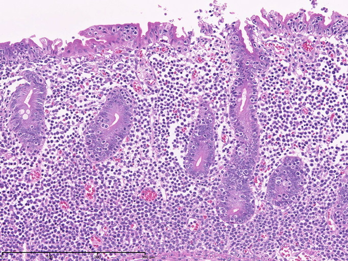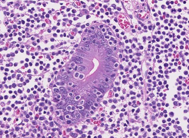 粘膜固有層には腫瘍細胞が充満し腺窩基底膜側より陰窩内に進入してIntraepithelial lymphocyte(IEL)の上皮浸潤を模倣する特徴的な蚕食像を示している。(Fig.4)