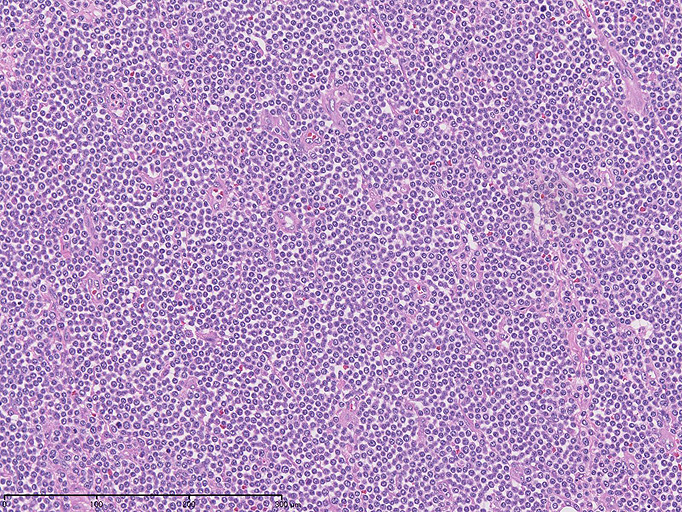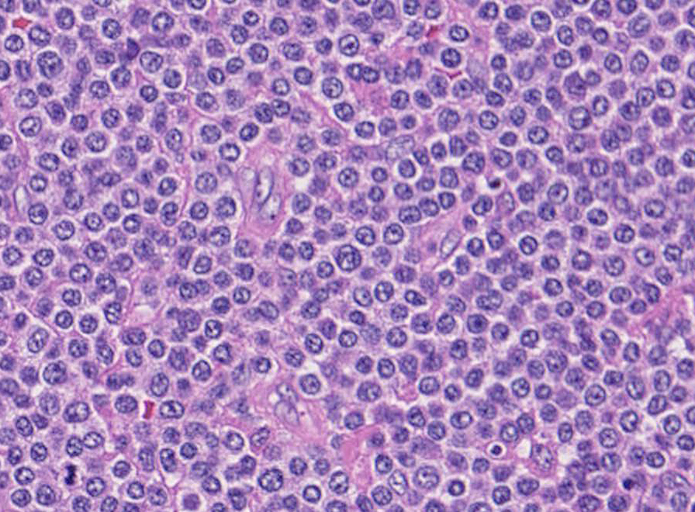 腫瘍細胞は腸管全層に密に浸潤している。粘膜表面は上皮が消失しびらんを形成。(Fig.1), 高倍率では中型, medium sized(組織球の核とほぼ同じサイズ)の類円形核をもつ比較的淡明な細胞質の異型リンパ球様細胞が密にmonotonousな増殖を示している。(Fig.2,3)