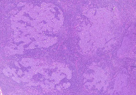 Floral variant of follicular lymphomaはマントル層の小リンパ球が腫瘍性濾胞の胚中心に侵入し濾胞が花弁状に断裂して見える濾胞性リンパ腫のまれな亜型である.*1 *2