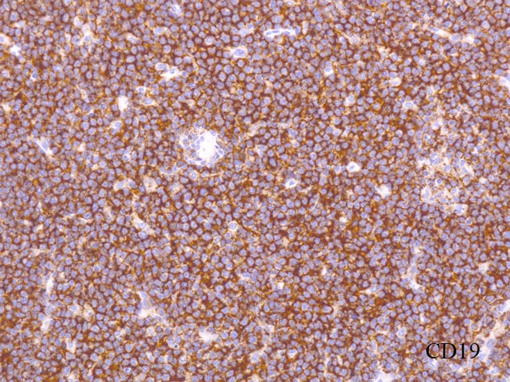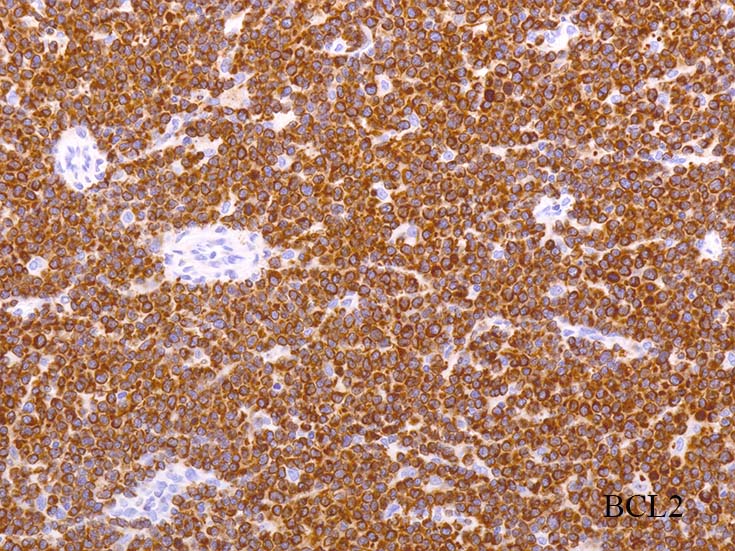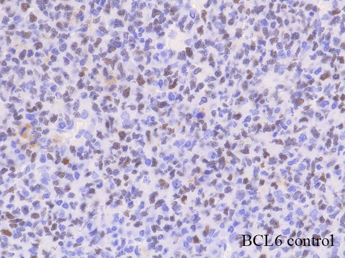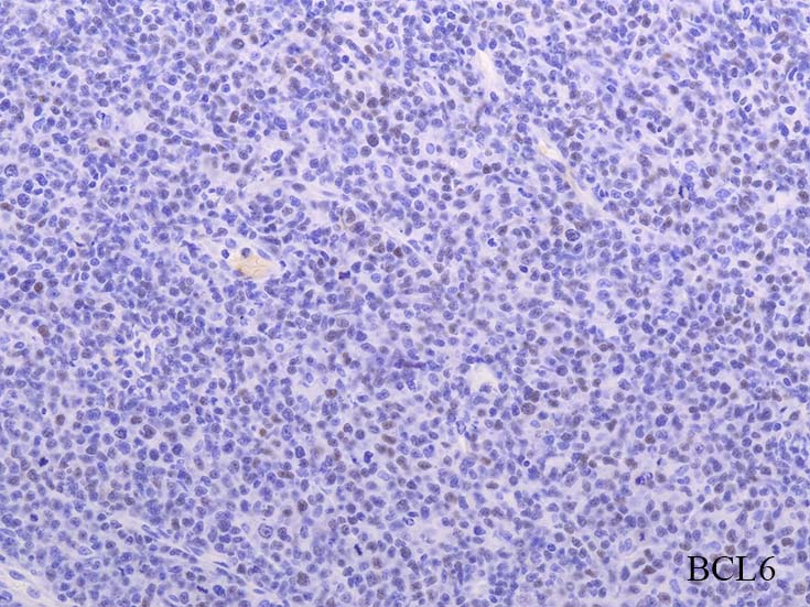 びまん性に増殖する中~大型異型リンパ球は, CD19+, CD10+, BCL2+, BCL6は+だが, controlに比べて発現がよわい傾向がある.