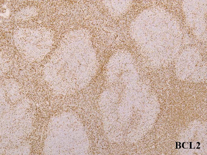 濾胞内の細胞はCD20+, CD10+, BCL6+の濾胞中心細胞であるがBCL2は陰性。陽性になっているのは follicular T-cellと考えられる. 胚中心外にCD10陽性細胞がこぼれ出るように多数認められる異常所見はFLに特徴的所見.