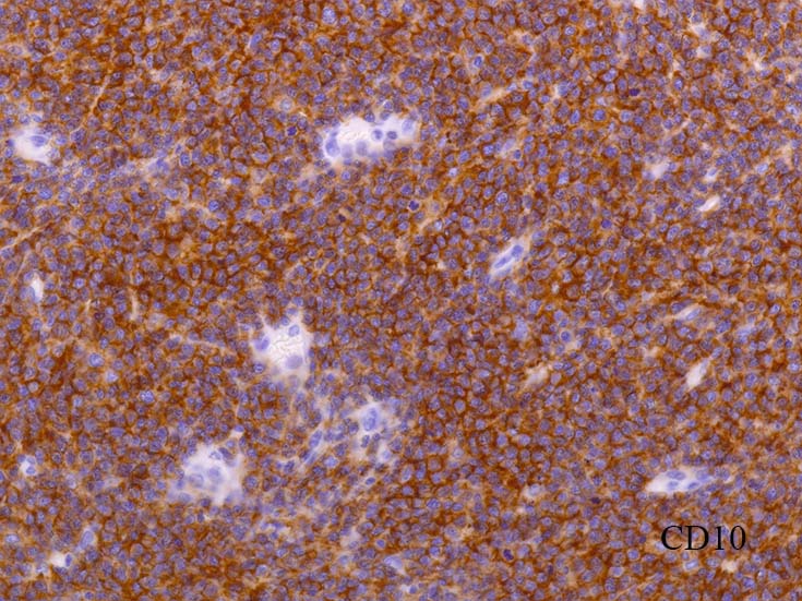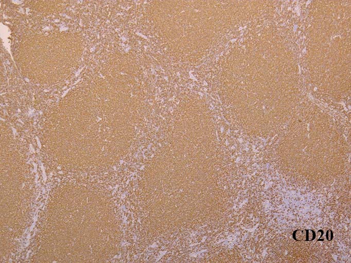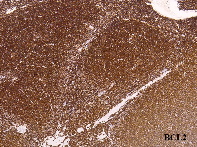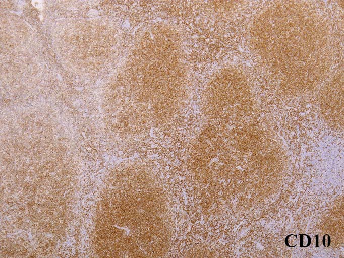 増殖リンパ球はCD20+, CD10+, BCL6+, BCL2+. CD10陽性細胞は濾胞外にも認められる. 異常所見.