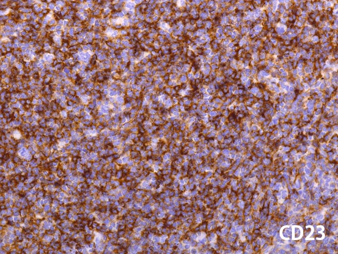 増殖細胞はMIB-1陰性が多い. びまん性に増殖リンパ球がCD23陽性を示す. CD21は陰性(上, loupe像)