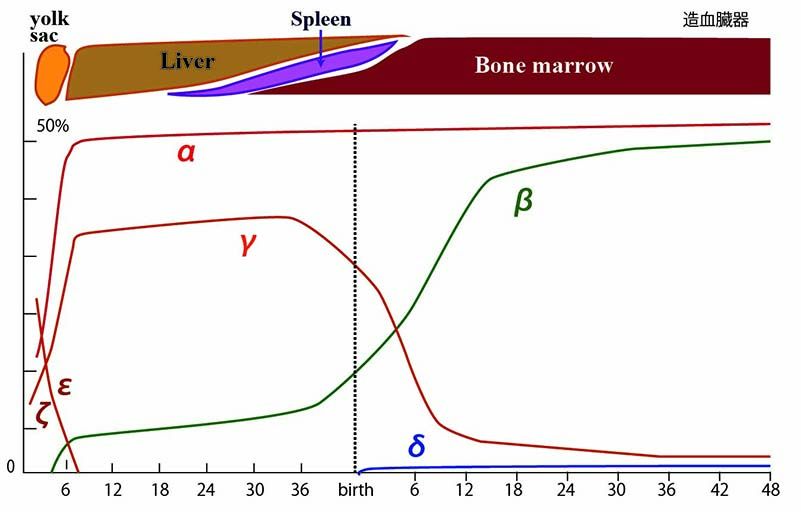 出生がちかずく妊娠30週ころにはγ鎖産生が衰え, かわってβ鎖生成が増加し出生を境にβ様鎖産生がγからβにスイッチする. 同様に,β鎖様の構造遺伝子δが作動開始し, わずかであるがδ鎖を生成し始める(HbA2). HbA2は出生後の時期に特有のヘモグロビン