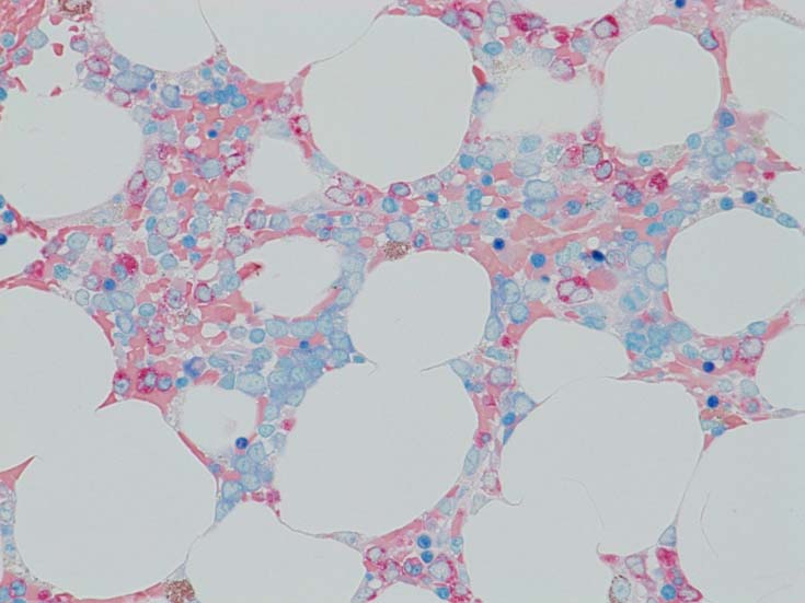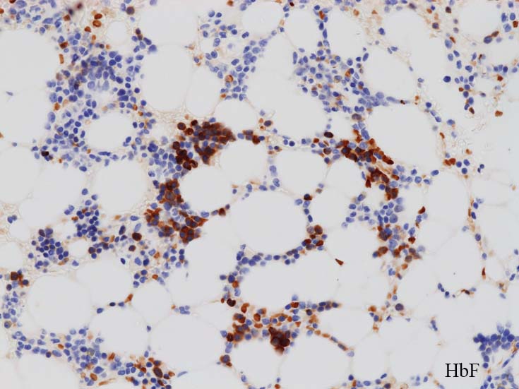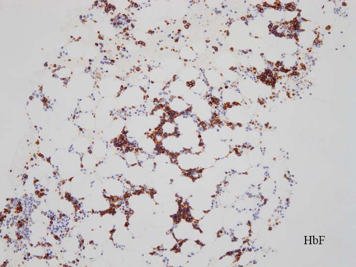 MDSでの赤芽球HbF発現は, 陽性細胞はそれほど多くない印象ですが, この低形成性MDS症例では, 多くの陽性細胞がaggregatesを形成していました.