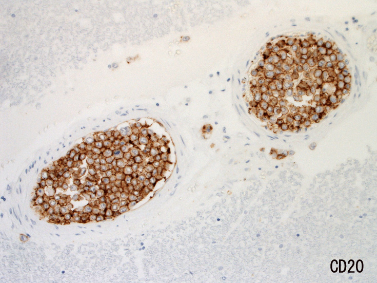 CD20陽性大型リンパ球の血管内増殖; 血管内増殖細胞はCD20陽性。