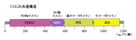 - JH2は偽キナーゼドメインでJH1に直接作用しJAK信号伝達を抑制的に調節する機能をもつと考えられている*1。
