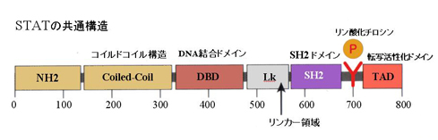 - SH2ドメインはリン酸化された受容体への結合および活性化、リン酸化STATの二量体形成に関与している。