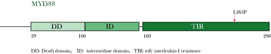 somatic mutationが, TIR(toll/ interleukin-1 resistance) domainに集中し、なかでもL265Pの頻度がたかくなっている。