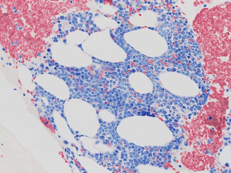 びまん性に芽球細胞が増殖, 正常造血は強く抑制されている。芽球の多くはASD陰性であるが, ASD陽性の芽球も存在する。smearでは細胞質顆粒をもつ幼若細胞とリンパ芽球様の顆粒のないN/C比大の芽球が存在しているようです。