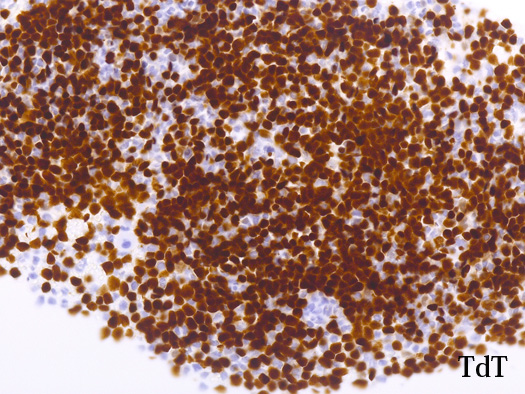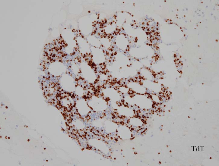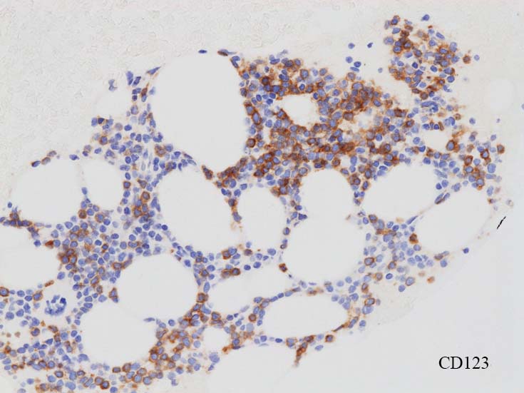blastic cellsは, CD45+, CD34+, CD38+, TdT+, CD7+, HLA-DR+, CD123+. cCD3-, sCD3-(FCM), CD20-, CD19-とCD79a-(?) (plasma cellが陽性でIHCでは判定が難しい), MPO-.