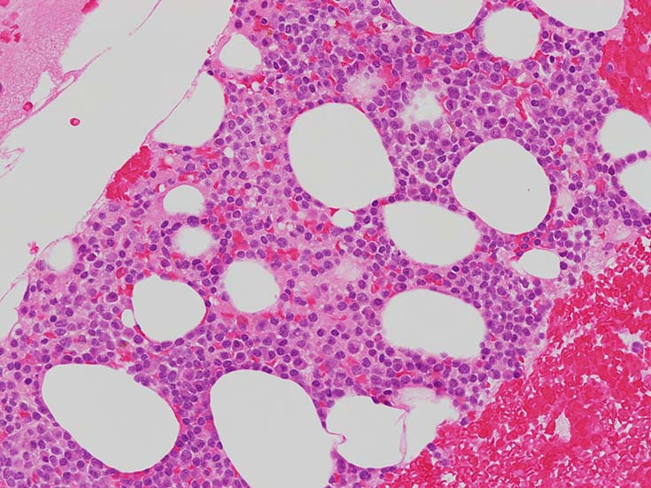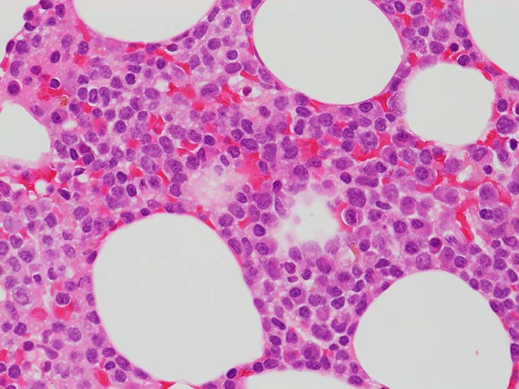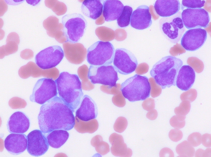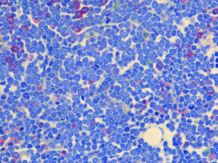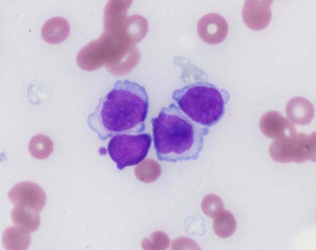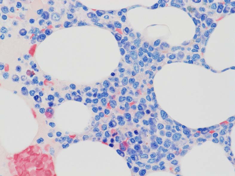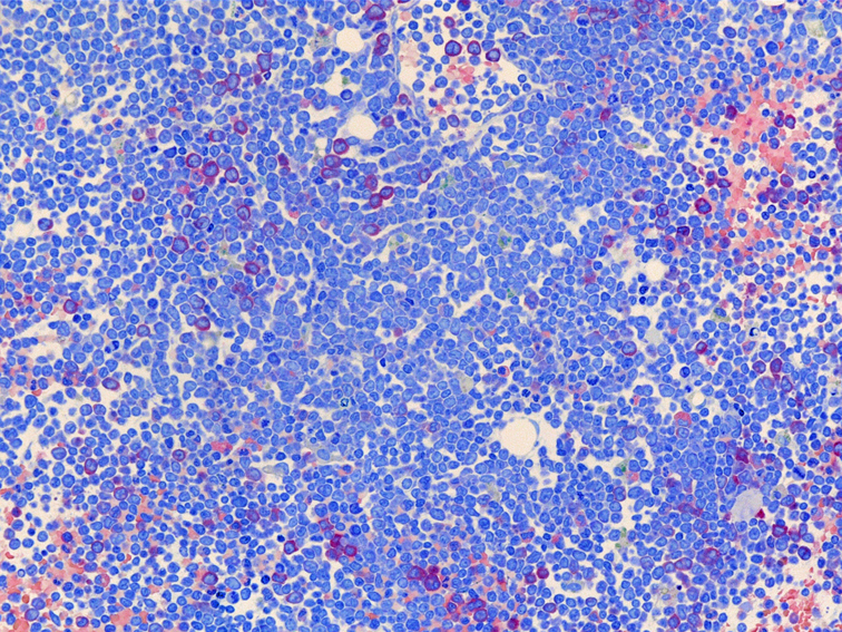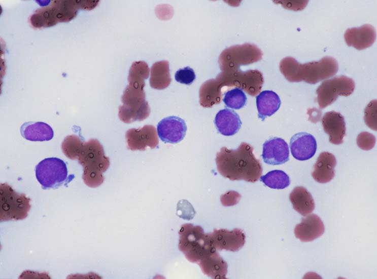 類円形あるいは, シワのみられるconvolutedな核に核小体をもつN/C比大の細胞が増加している. クロマチンは微細で核は淡明にみえる.Naphtol-ASD-CAE染色陰性.幼若あるいは活性化されたリンパ球様細胞に似ている.
