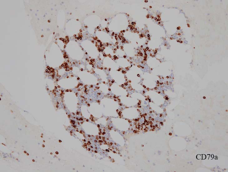 CD3-, CD79aは増加しているplasma cellsが陽性で判定が難しい. CD10-, MPO-. (CD10は画像欠)