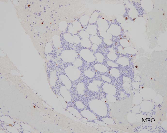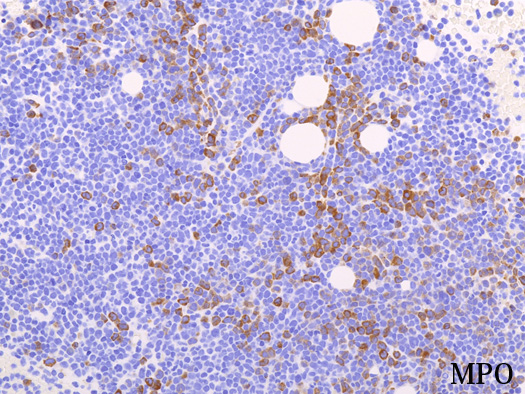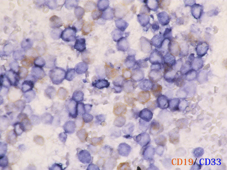 芽球はCD19陽性で, CD10, CD79aが陽性を示す。またMPO陽性芽球が領域を異にして染色された. CD19, TdT陽性の芽球とは別個の芽球であることが二重染色(骨髄球系マーカはCD33で示したが)でも推察される。CD20, CD3は陰性.