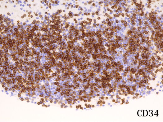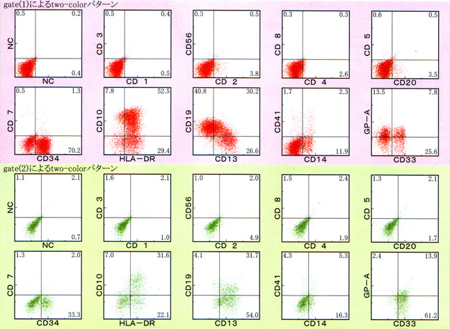 AULはcCD3、MPO、CD19、cCD22、およびCD79a発現を欠き, 通常1つの表面系統マーカー( CD13、CD33、またはCD7など)のみを発現する.CD38またはTdT発現を伴って, CD34およびHLA-DRが陽性になる. *2