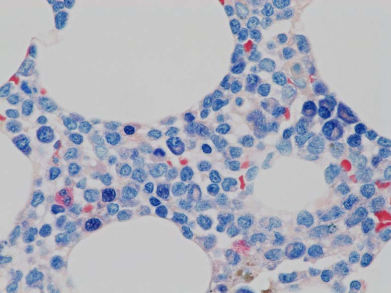 cellularityは60-70%. 赤芽球血島形成はみられない. Naphtol-ASD-CAE染色に赤染される顆粒球系細胞もごくわずか. 成熟Mgkもごく少数で, 正常造血は強く抑制されている.