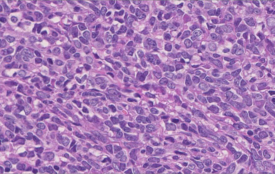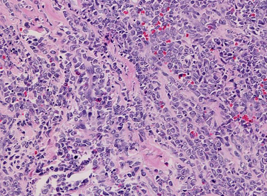拡大像では, 類円形, 卵円形, non-cleaved nucleiをもつN/C比大の大きさのそろった細胞がシート状密に浸潤増殖している.