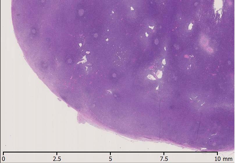 腫大したリンパ節, 20x17mm. 萎縮した胚中心をもつ濾胞が散在する. 一見, Castleman病様の像. よく見ると, 線維化し軽度に肥厚した被膜下に小リンパ球の乏しい, 低倍で明るくみえる領域を視認できる.(サムネイル画像をクリックで大きな画像がみられます)