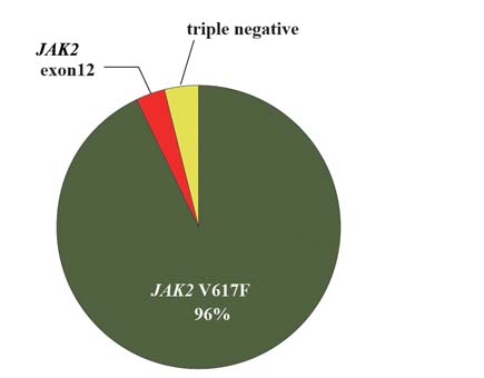 ■JAK2exon12変異が約4%の患者さんにみられ, この患者さんのほとんどは赤血球増多単独 である.