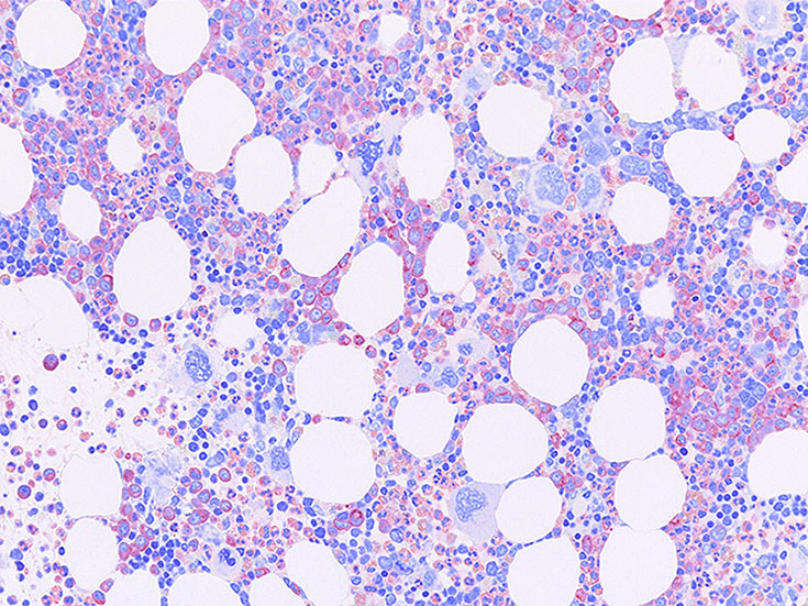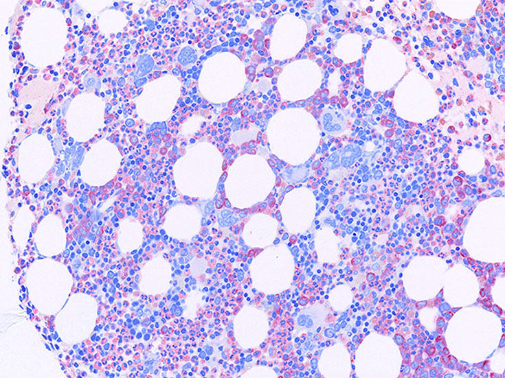 CMLの巨核球は小さめで散在性. 凝集はみられない. pureなCMLでは血島が消える.