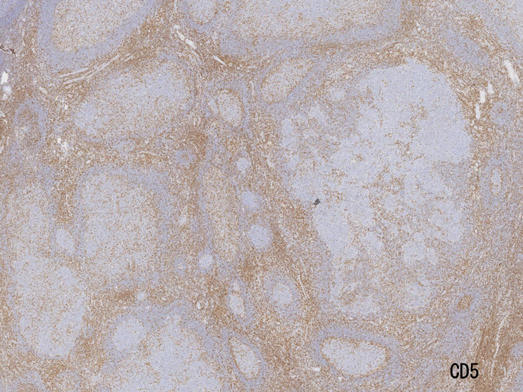 不整形の胚中心(CD20+, CD10+, BCL2-)のまわりにはCD5陽性リンパ球が多く存在してマントル層を形成している. (IgD染色でもマントル層はよく認識できる). 胚中心内のCD5+ cellはfollicular helper T-cellのようです.