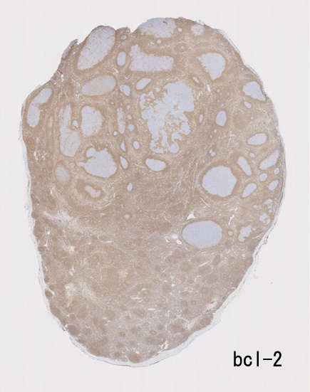 大きな胚中心を持つ多数のリンパ濾胞が見られる。胚中心の辺縁は不明瞭でマントル層も薄くなっている。1カ所マントル層リンパ球の侵入によりバラバラになった巨大な胚中心が認められ, macrofollicular patternと記載されるPTGCです。