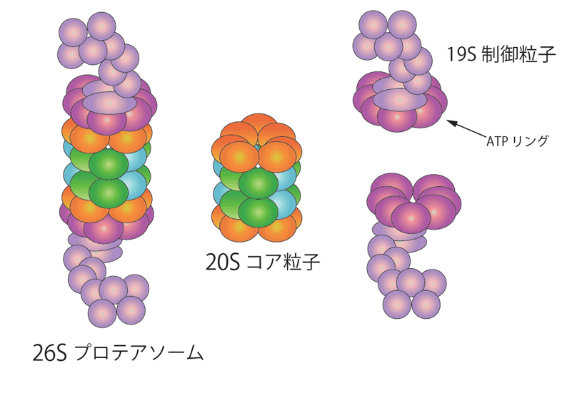 プロテアソームはプロテアーゼ活性をもつ複合体の20Sコア粒子の両端あるいは片側に19S複合体(PA400ともよぶ)が会合した26Sプロテアソームである.