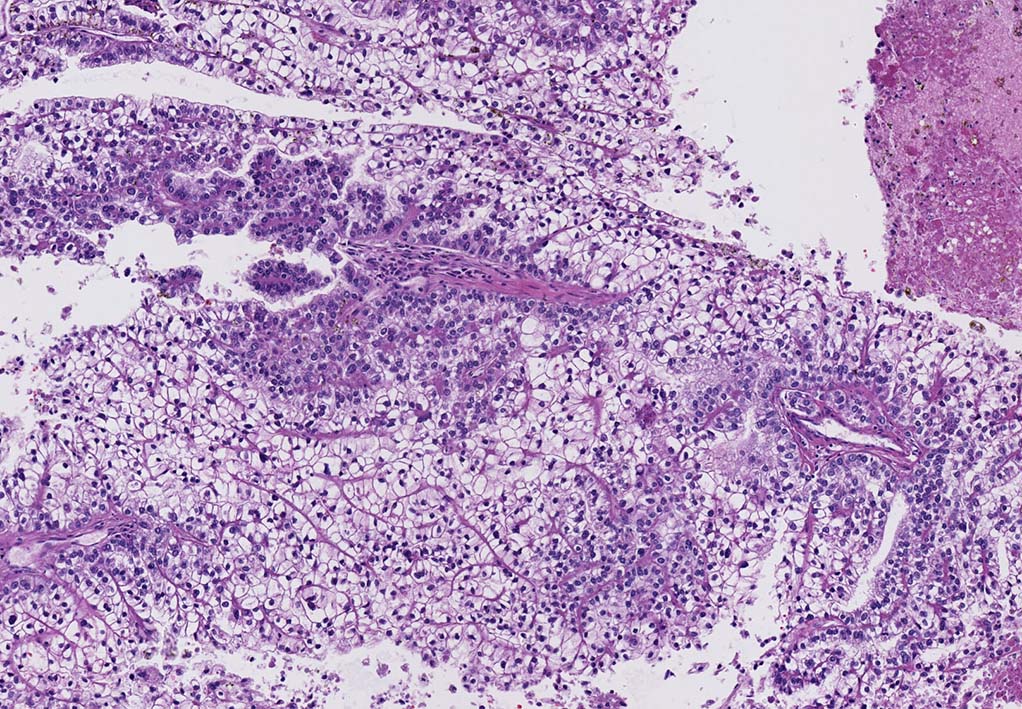 腎細胞癌の約70%を占める(65-70% in adult RCC)淡明または好酸性の細胞質を有する細胞と壁の薄い,繊細で鹿角状(staghorn-shaped)の豊富な血管網から構成される悪性腫瘍. 形態は多彩.