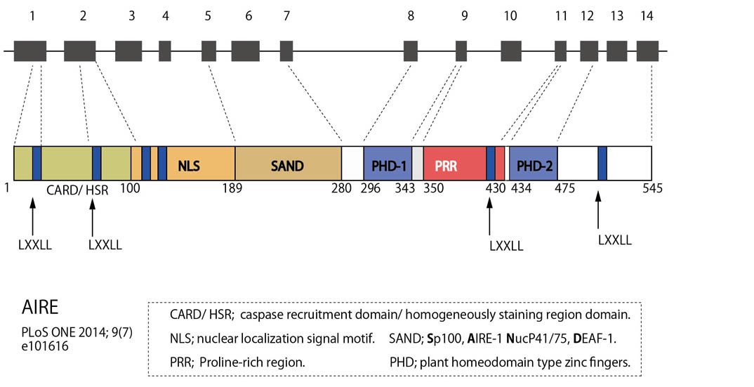 Aireは遺伝性自己免疫疾患の「自己免疫性内分泌症・カンジダ症・外胚葉ジストロフィー」(autoimmunepolyendocrinopathy-candidiasis-ectodermal dystorophy; APECED)の原因遺伝子として同定された。*21