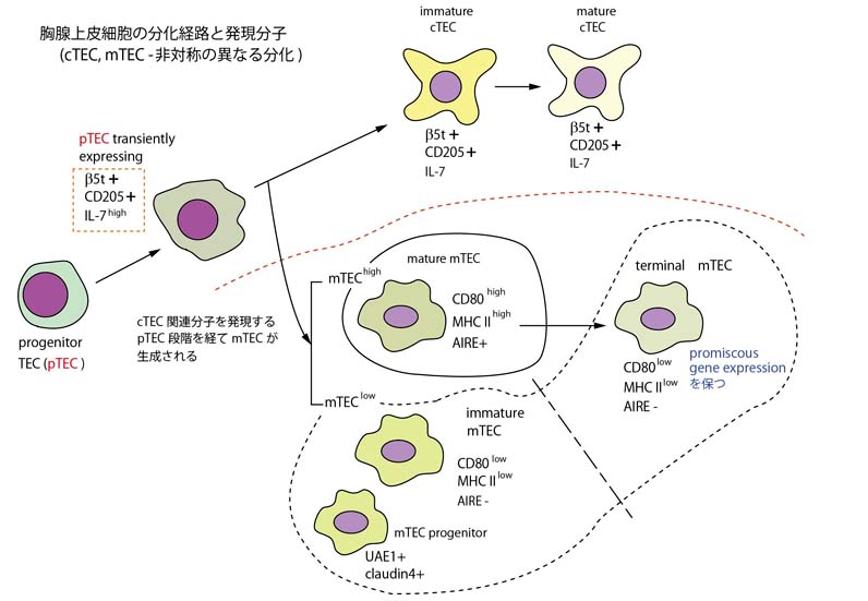 胸腺上皮細胞;細胞数は少ないが胸腺皮質(正の選択の場), 胸腺髄質(負の選択の場)において免疫システム形成の根幹を支える細胞集団である。T細胞の分化, 選択と機能獲得の研究に比較して上皮細胞の分化や組織形成自体に関するメカニズムについては不明な点が多く残されている。