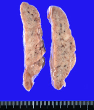 右図は乳児胸腺肉眼像および割面像。この胸腺標本には中央で割が入っています。