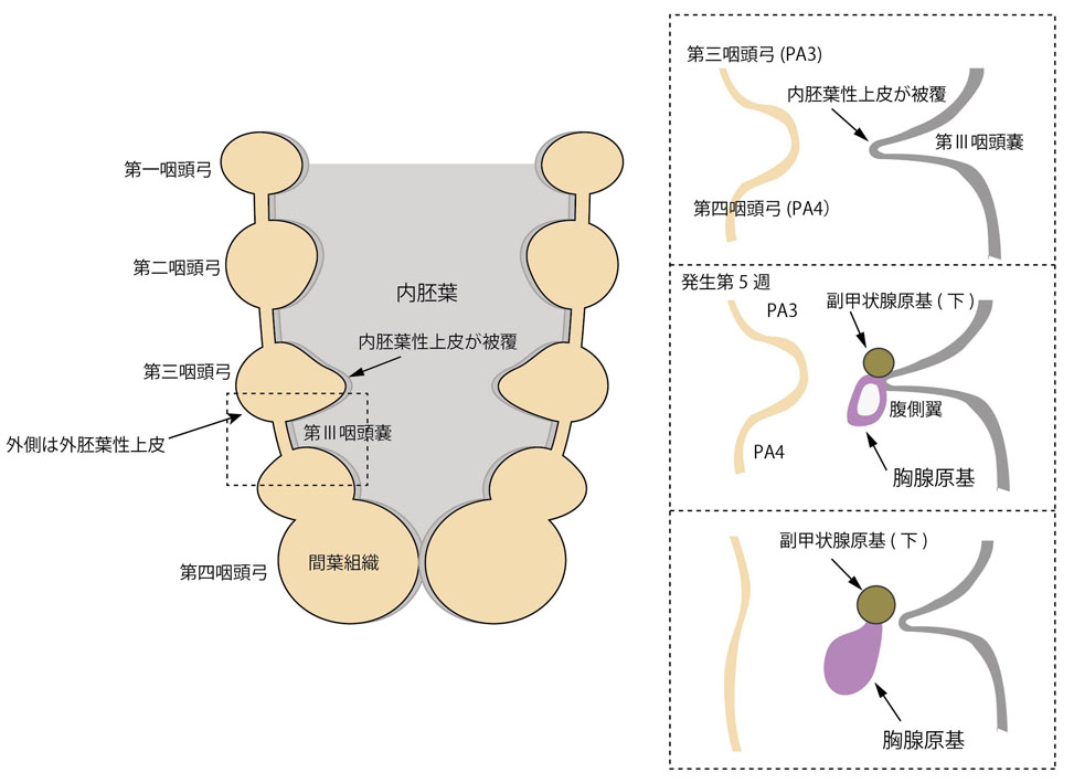 第三咽頭嚢の末端に腹側翼, 背側翼があり, 腹側翼の上皮が分化して胸腺を形成する。背側翼は下上皮小体(副甲状腺)になる。両者の腺は咽頭壁と連絡を失い, 胸腺は下副甲状腺を引き連れて尾内方へ移動し最終的に胸郭内へ移動して反体側の胸腺と癒合する.
