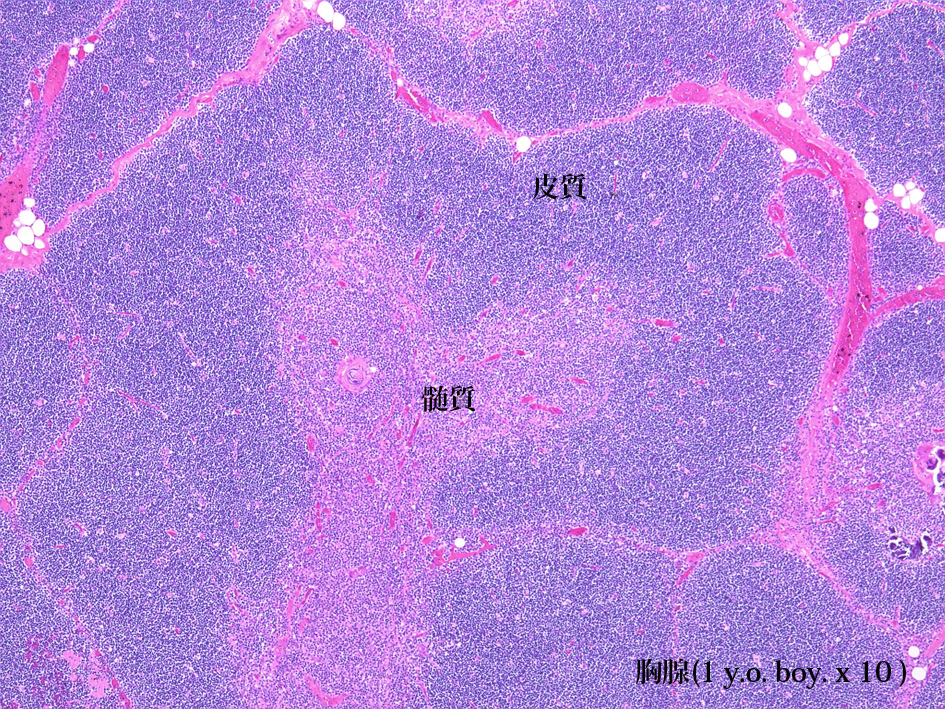 左右二葉の胸腺は, 小葉構造をとり各小葉は分化途上のT細胞に相当する小リンパ球(胸腺細胞; thymocyte)が密に存在する皮質(cortex)と小葉中央部に存在する, 皮質と比較してリンパ球密度の低い髄質(medulla)から構成される。
