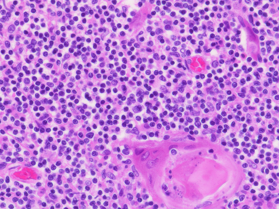 髄質のリンパ球は大リンパ球が多く, 皮質リンパ球より細胞質に富む.髄質はHEで明るく見える. 髄質にはHassal小体(上図,右下)が散在している.