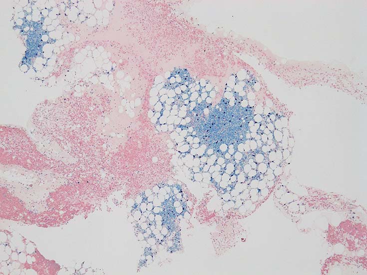 Bone marrow clot sectionでは, nodularな病変形成が認められる. HEでは不明瞭であるが, Naphtol-ASD-CAE-Giemas染色では mast cellの顕著な増加が明瞭に認識される.